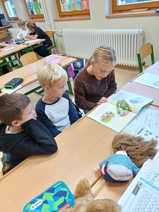 Seit dem Herbst 2023 treffen sich die 1B und die 4A regelmäßig und lesen sich gegenseitig vor. Am Beginn des Schuljahres 23-24 haben die Viertklässler den Erstklässler vorgelesen und mittlerweile macht bereits die 1. Klasse große Lesefortschritte und kann schon der 4. Klasse kurze Texte vorlesen.